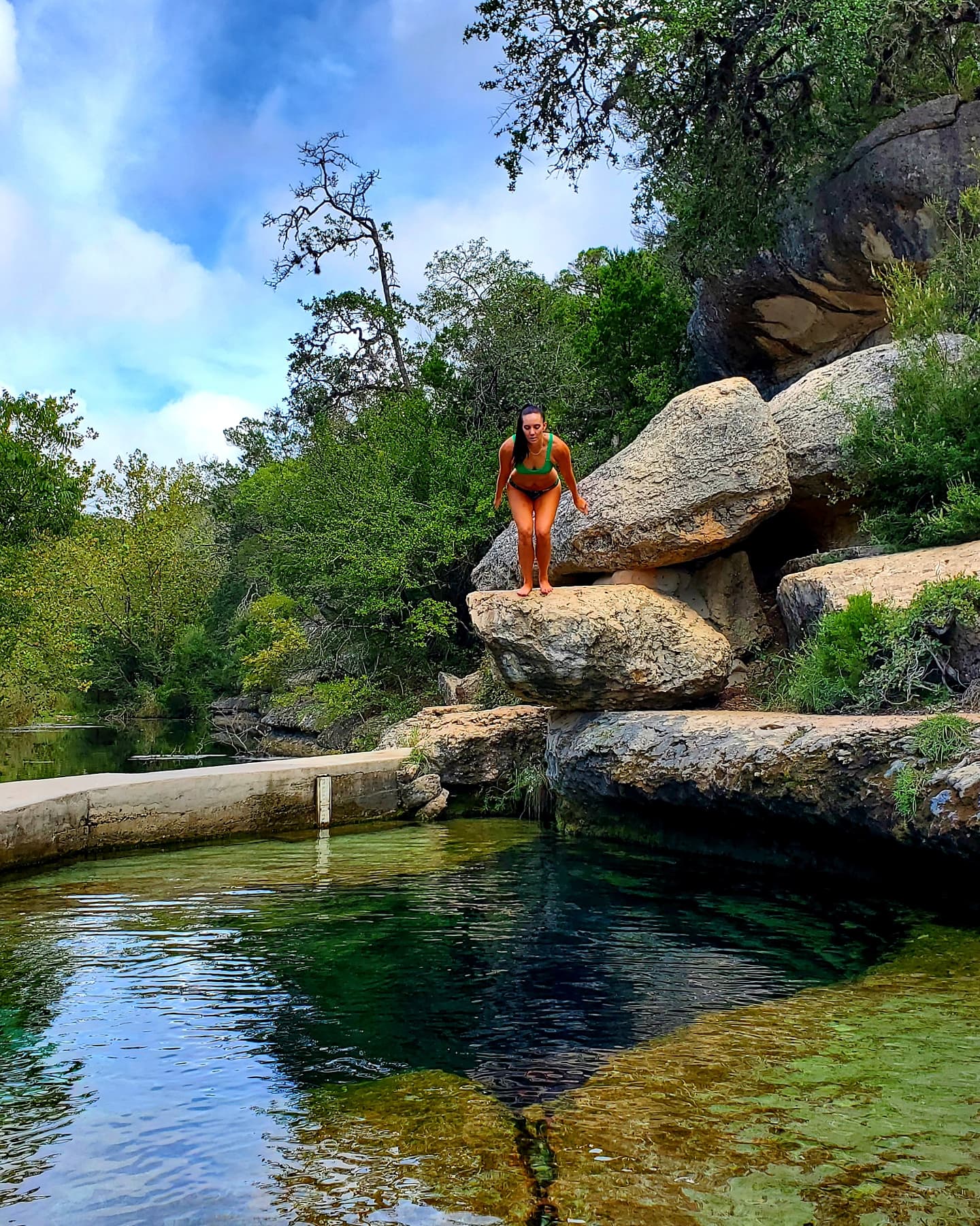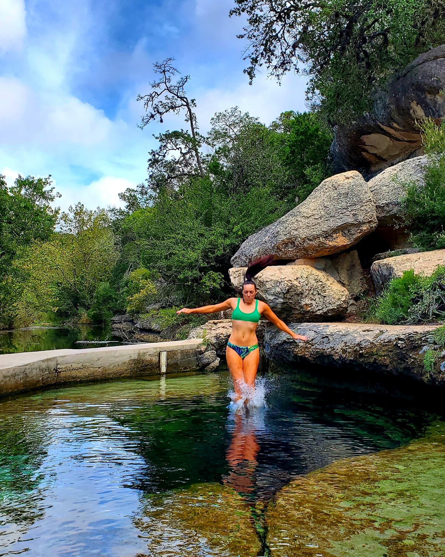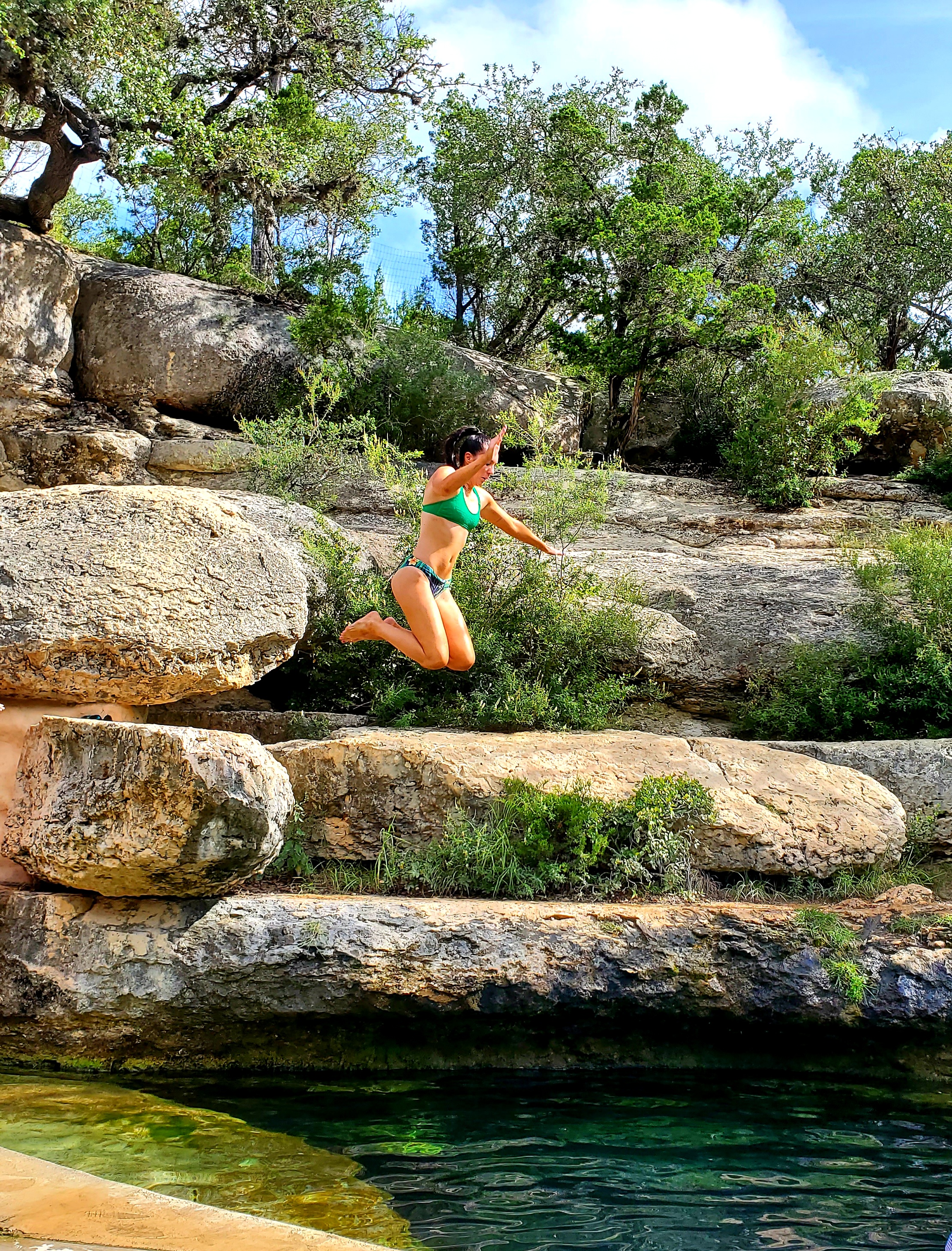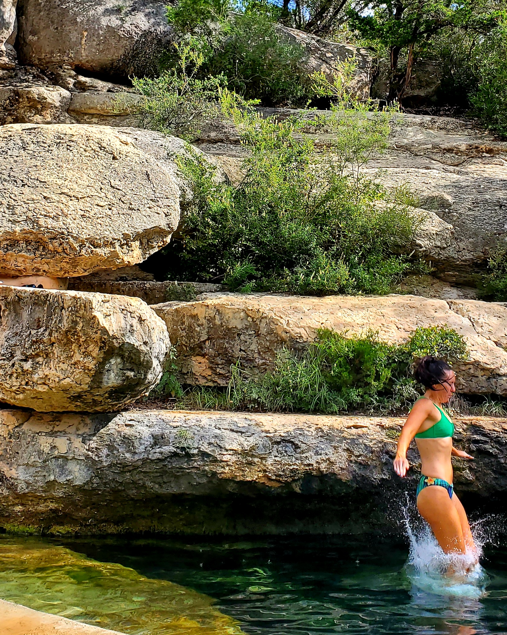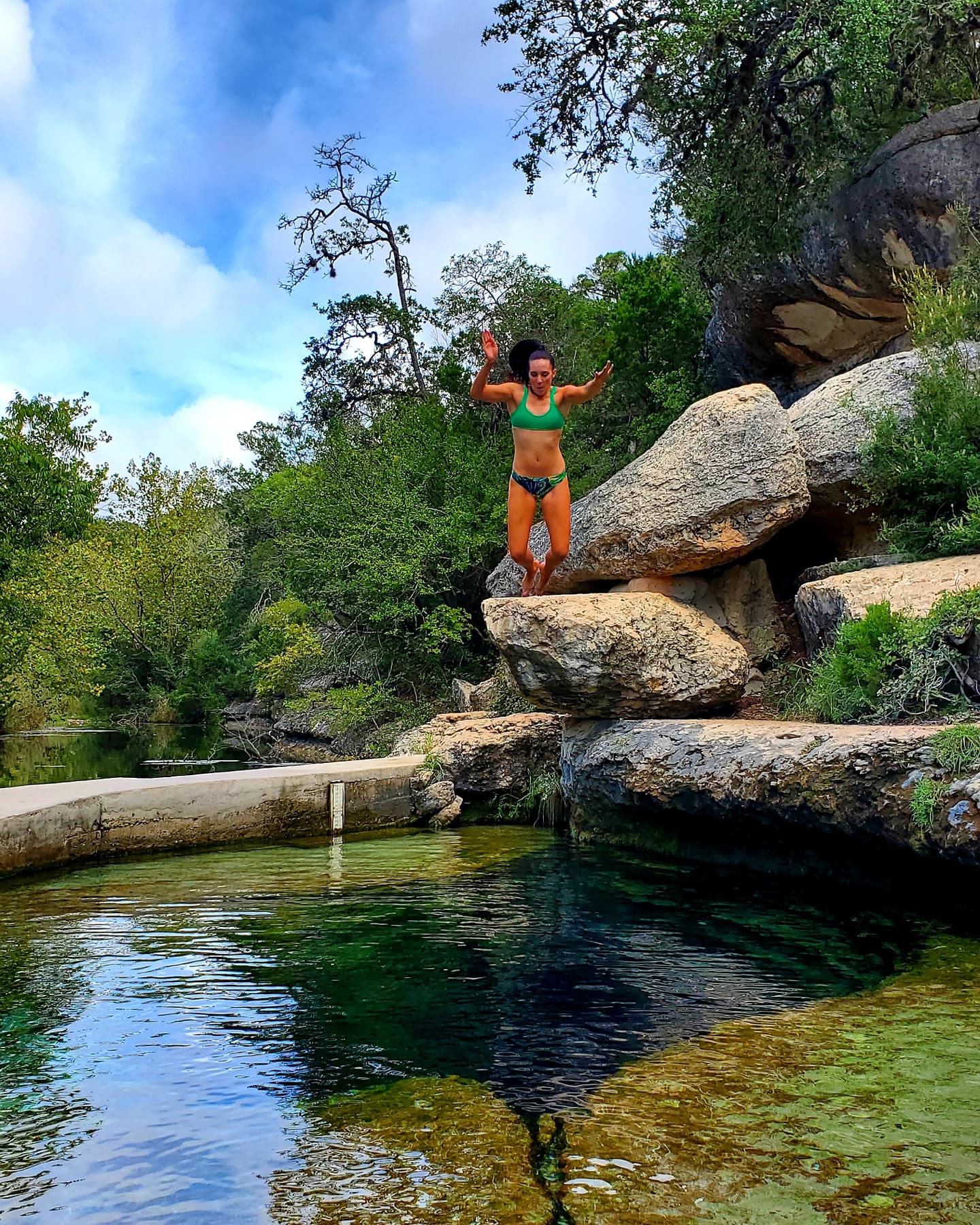 • Jump! Part of the Jacob’s Well experience is jumping from the rocks that overlook the well. The first two times we visited we didn’t jump and I kind of feel like we missed out. The third time we went I knew I wanted to try it and I’m so glad we did. For one thing the cold temperature of the water is less of a shock jumping in rather than slowly getting used to it. The second thing… it’s fun! I felt like a kid again. Don’t get crazy or dangerous and try any wild dives but jumping from the lower rocks is a blast. I didn’t know how much fun it could be until I decided to jump…. and jump again! Keep scrolling to see both of my jumps in action!